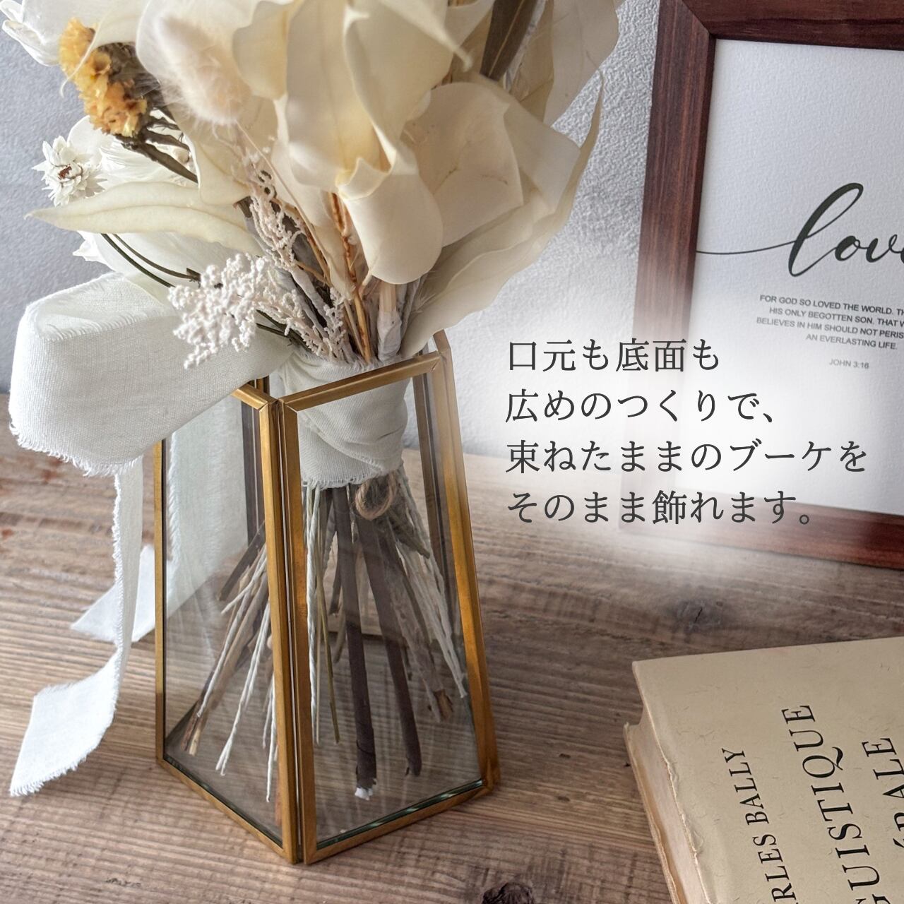 大切なブーケを美しく飾れるフラワーベースをご用意しました。