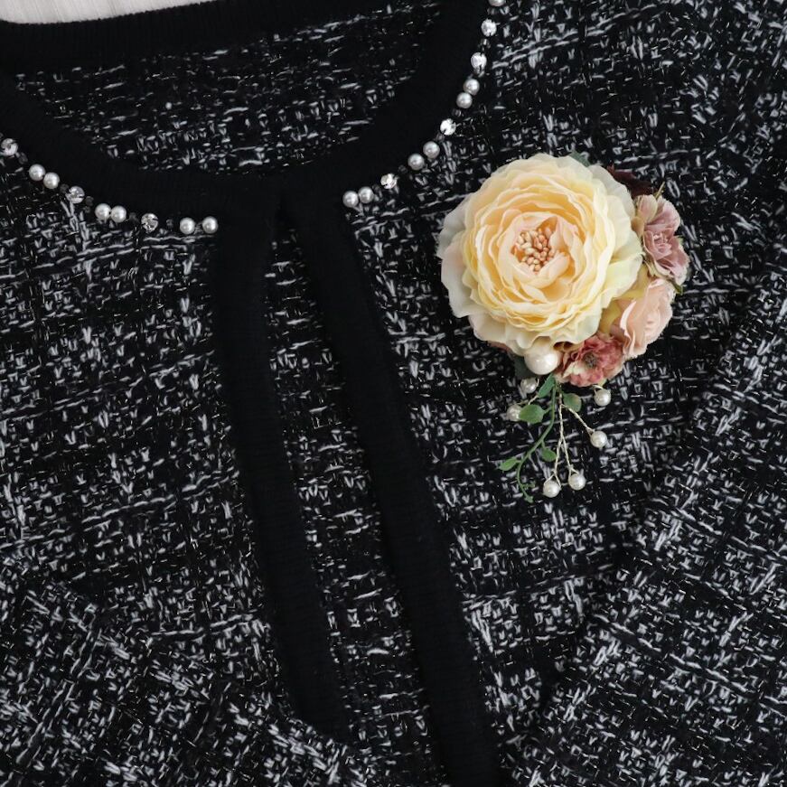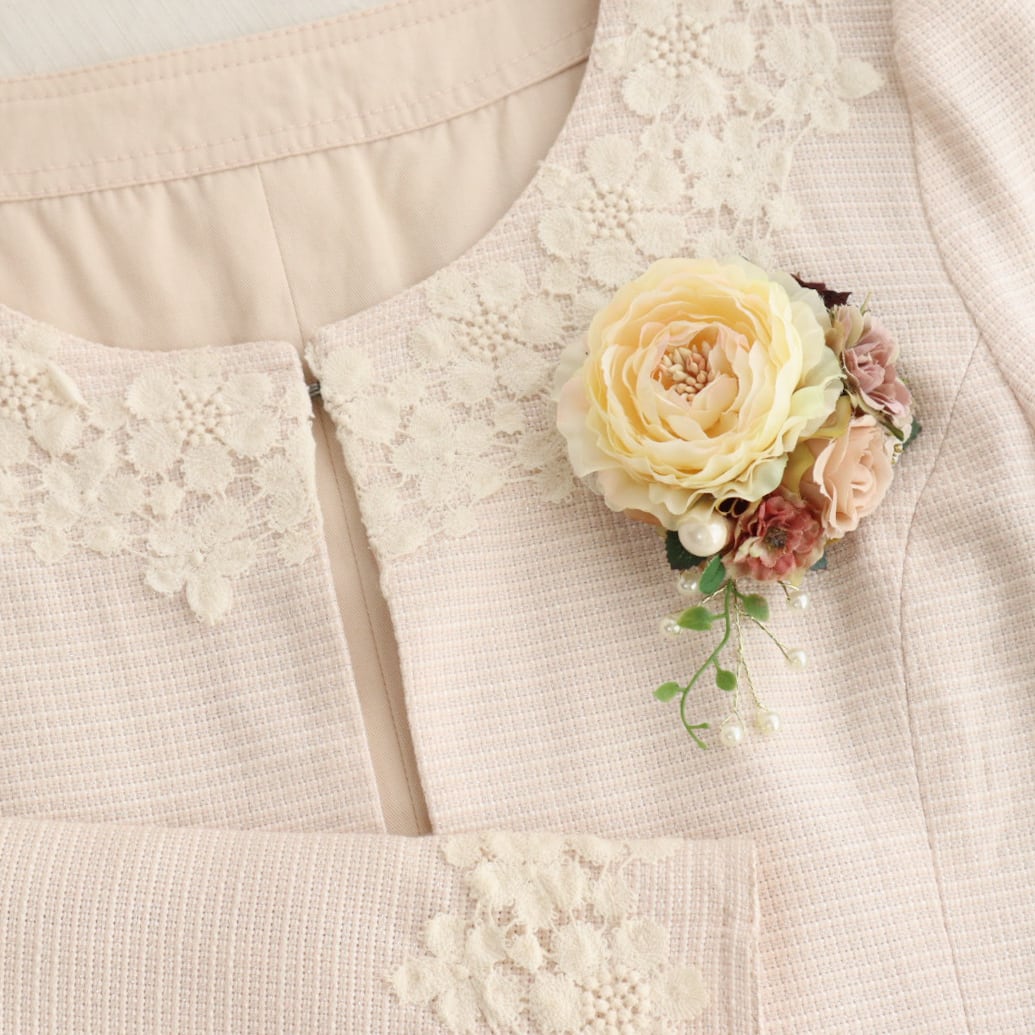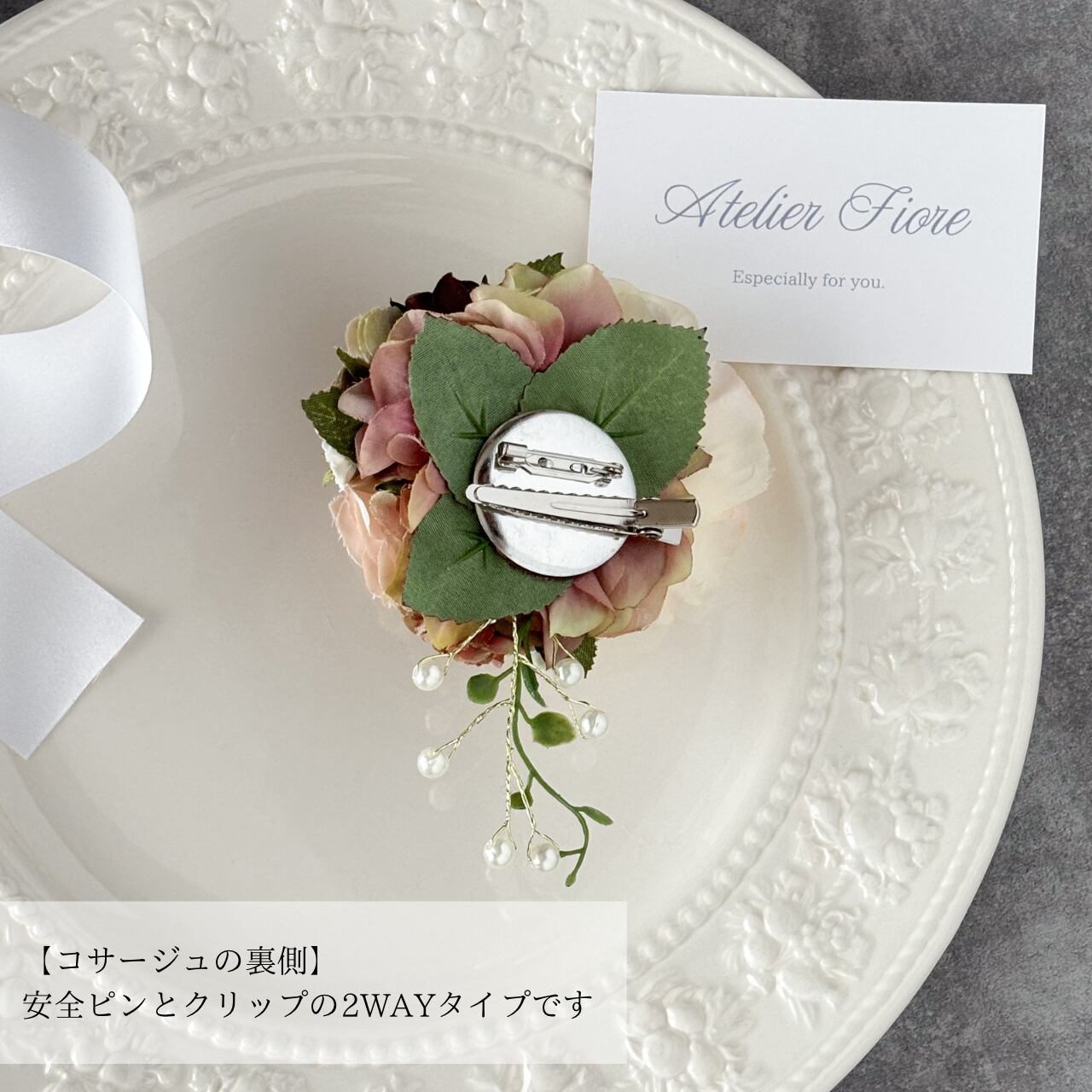 装着は安全ピンとクリップの2WAYタイプで、お花は全てアーティフィシャルフラワーを使用していますので長く、様々な行事でお使いいただけます。